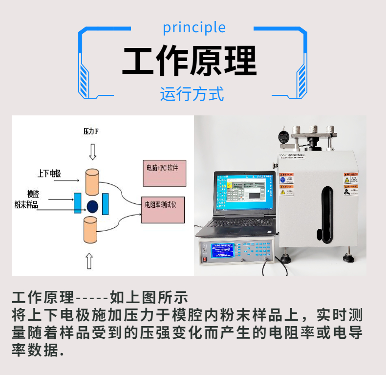粉末電阻率測試儀的工作原理:將上下電極加壓于模腔內(nèi)粉末樣品上,實時測量隨著樣品受到的壓強變化而產(chǎn)生的電阻率或電導率數(shù)據(jù).