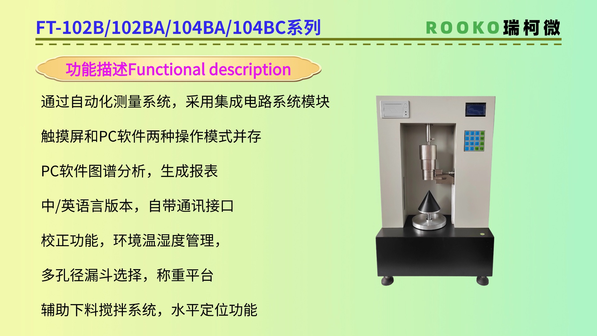 特點:休止角測定儀通常具有測量準確、操作簡便、重復性好等特點。此外,一些休止角測定儀還具有自動化測量、數據記錄和分析等功能如FT-104BA。