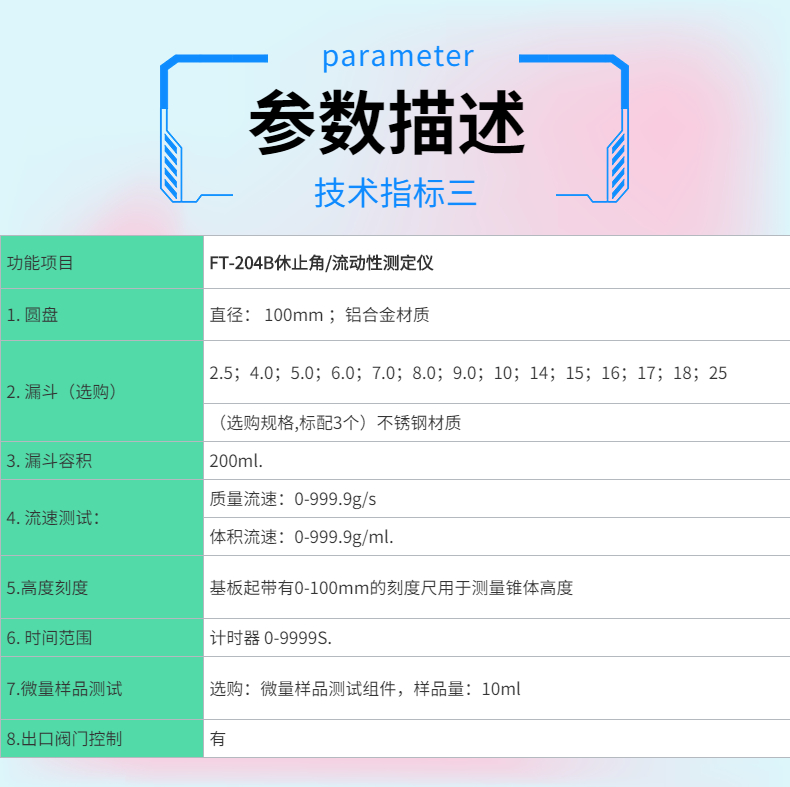 測試粉末和顆粒通過漏斗的時間和形成的角度,測試前進行預堆積,從而已知樣品量,將已知質量粉末從漏斗流出而形成的堆積角,以及流出所需要的時間;可以獲得休止角和流速數據。
