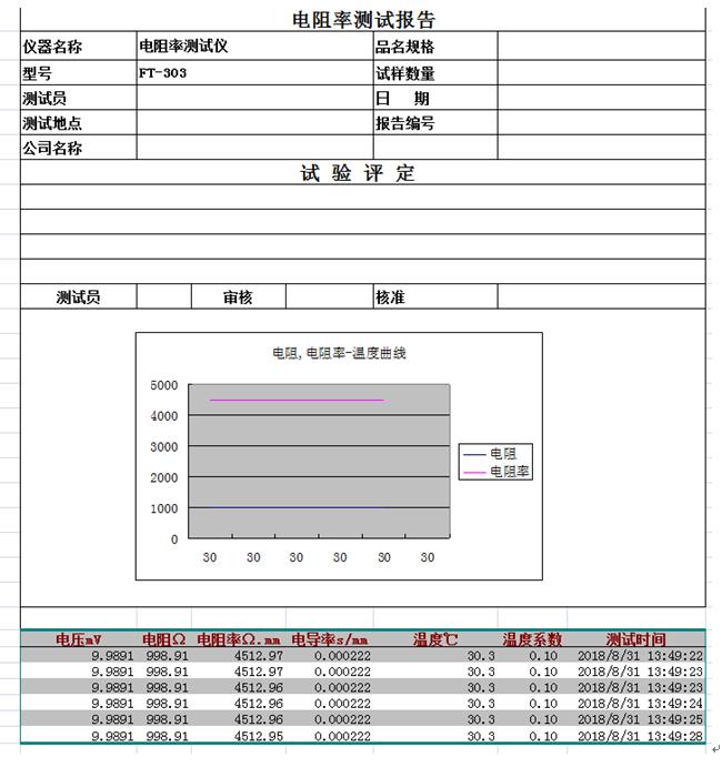 PC測試軟件USB通訊接口,軟件界面同步顯示、分析、保存和打印數據!溫度與電阻、電阻率的關系曲線;時間與電阻率、電阻的關系曲線. |
