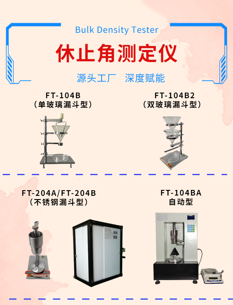 測試粉末和顆粒通過漏斗的時間和形成的角度,測試前進行預堆積,從而已知樣品量,將已知質量粉末從漏斗流出而形成的堆積角,以及流出所需要的時間;可以獲得休止角和流速數據。